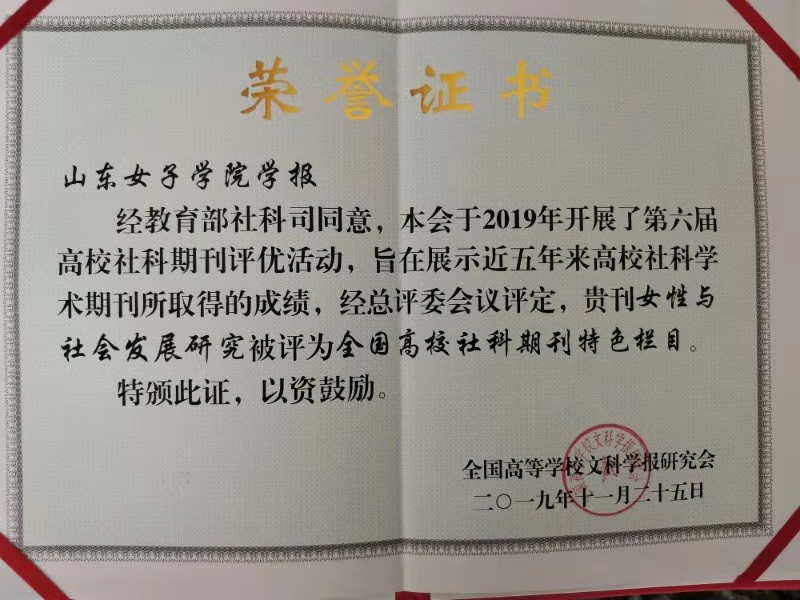 《山东女子学院学报》编辑部将以此次获奖为契机,努力提升办刊质量和学术水平,进一步彰显办刊特色、扩大学术影响,为打造特色鲜明的高水平妇女/性别研究专刊贡献力量。