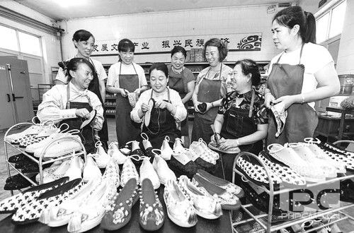 山西省临汾市尧都区开设“巧手扶贫车间”,为农村留守妇女探索出一条“送岗上门、就近就业、巧手脱贫”的致富新路子。图为技术人员在一起交流纳鞋底技能。 图片来自网络