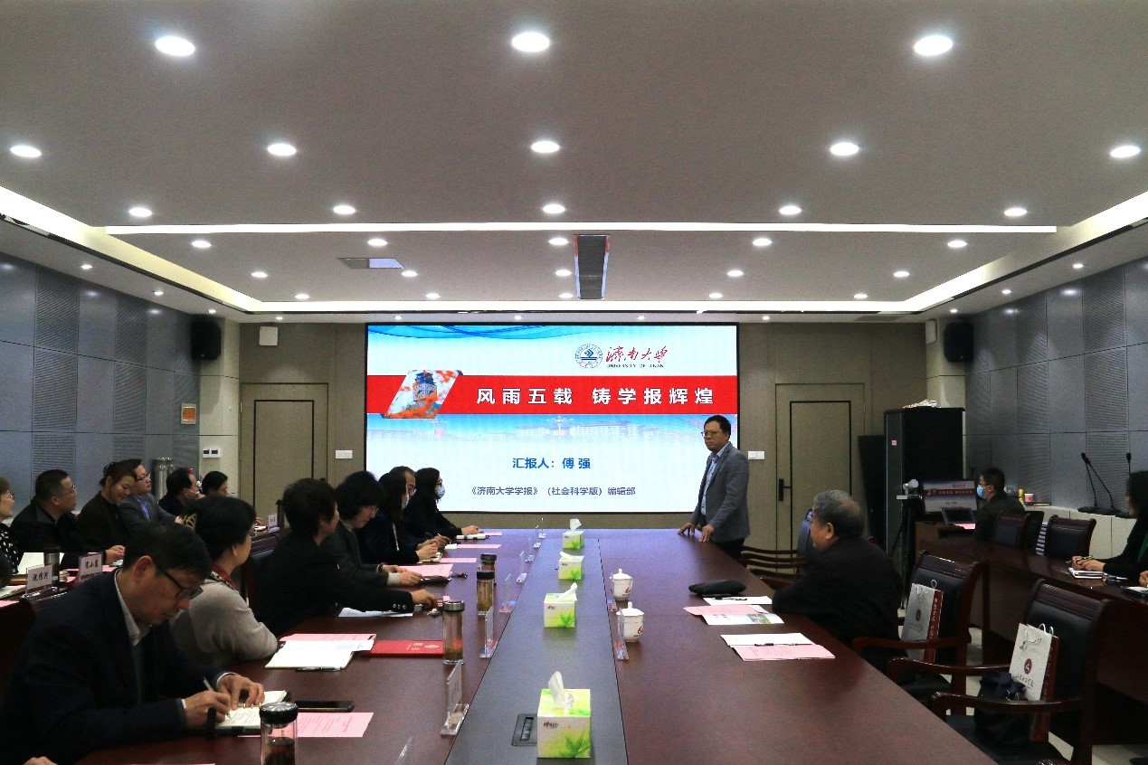 仪式伊始,刘恩允介绍了武卫华编审的工作经历并介绍了学校学报的办刊历程。然后,《济南大学学报(社科版)》主编傅强简要分享了《济南大学学报(社科版)》从普通期刊到中文社会科学引文索引(CSSCI)来源期刊的发展历程和经验,介绍了武卫华编审在担任《济南大学学报(社科版)》主编期间的突出贡献。