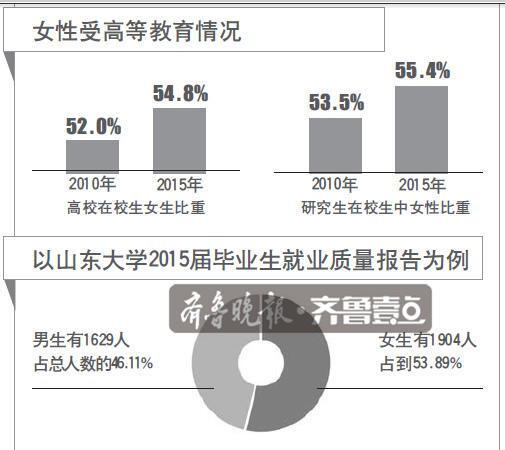 2015年山东在校女研究生比重已经增至55.4%。近日山东省妇联发布的我省妇女儿童发展“十二五”规划实施情况终期评估报告显示,高等教育中女性比重一路看涨,但同时女性在职场上的发展却逊于男性,2015年女性占就业人员的44.3%。