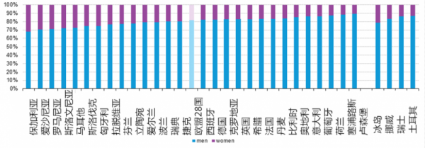 这张图表显示了2014年欧洲国家中,信息通信专家的性别比例。