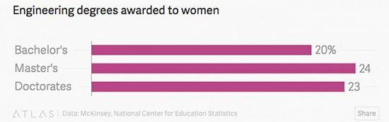 麦肯锡认为,这种性别失衡首先来自于教育过程中出现的数量差距。高等院校招工科招收的女性学生非常少,学士学位中只有20%是女生,硕士学位女性占24%,到了工程学博士学位占比为23%。