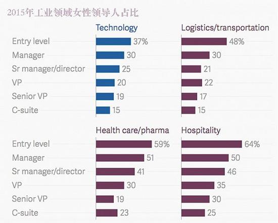 麦肯锡本月发布的一份报告显示,技术、能源、汽车和工业制造业等领域对女性来说几乎是“无法进入”的行业。麦肯锡通过对来自118个公司的30000名员工进行统计后发现,物流、交通、医疗行业中的女性大多数都在集中从事初级工作,只有少数人晋升成为中层管理人。而在零售、电信、金融行业中,被提升起来的女性中层管理者较多,但进一步发展到高级领导人的却依旧很少。